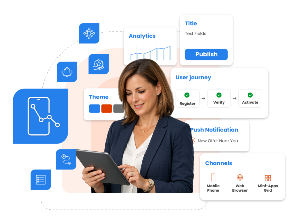 Powers the front-end experience for Digital Wallet, Digital Banking, Agency Banking, and SuperApp Framework. Journeys, content, campaigns, and analytics controlled from one surface across all products.